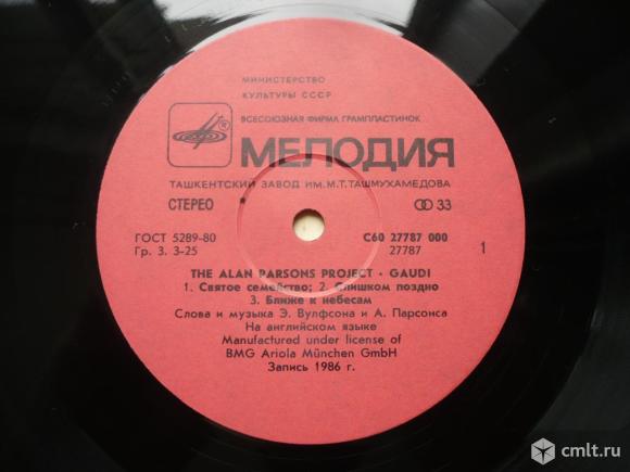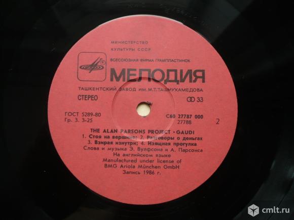 The Alan Parsons Project. Gaudi. Авторы музыки и слов Э. Вулфсон [Eric Woolfson] и А. Парсонс. Запись 1986 г. Arista, 1987. Manufactured under license of BMG Ariola Munchen GmbH. (C) "Мелодия", 1988. СТЕРЕО С60 27787 000. ГОСТ 5289-80. Ташкентский завод грампластинок им. М. Т. Ташмухамедова (красные лейблы). Узбекистан, СССР. Жанры: Electronic, Rock, Pop. Стили: Prog Rock, Symphonic Rock, AOR, Synth-pop, Pop Rock. Пластинка прослушана: визуально отлично [E], в основном играет идеально [M-]. Обложка: хорошо [G+], внизу легкие следы от намокания.