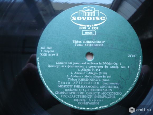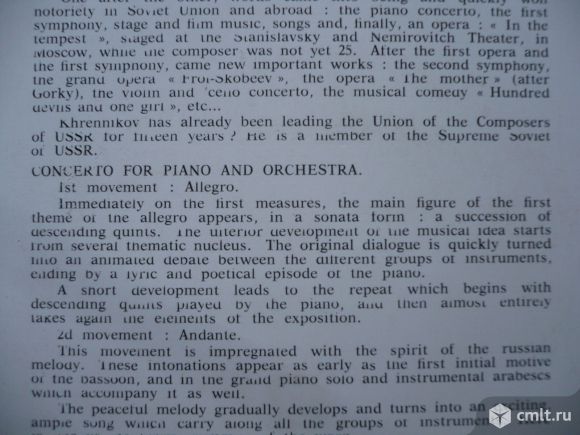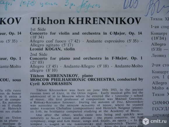 Концерт для скрипки с оркестром до мажор, соч. 14. Леонид Коган, скрипка // Концерт для фортепиано с оркестром фа мажор, соч. 1. Тихон Хренников, фортепиано. Симфонический оркестр Московской государственной филармонии, дирижер Кирилл Кондрашин. Пластинка прослушана: очень хорошо [vg]. Обложка: очень хорошо [vg].