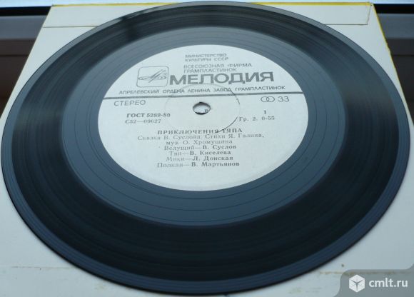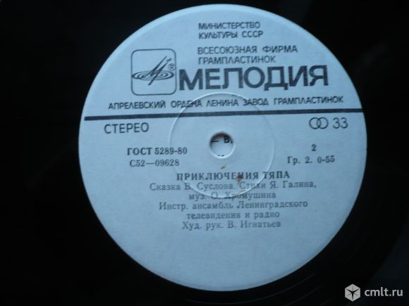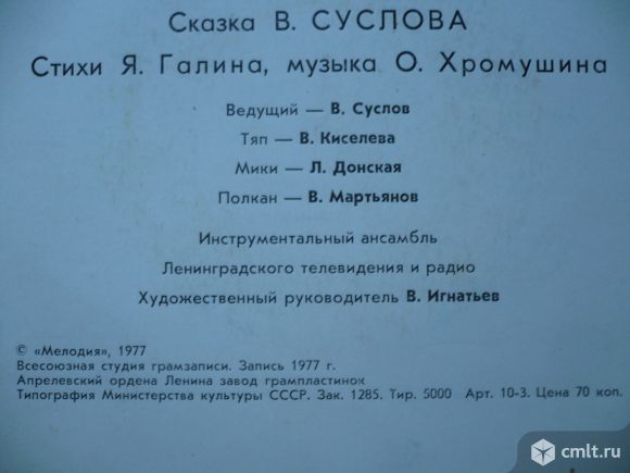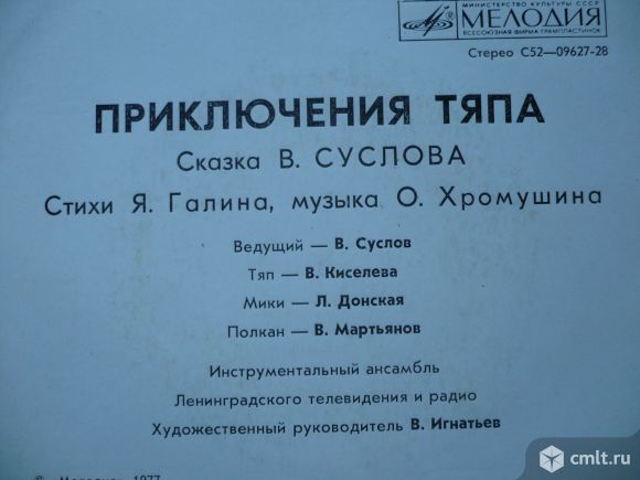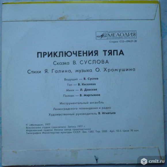 Стихи Я. Галина, музыка О. Хромушина. Ведущий - В. Суслов, Тяп - В. Киселева, Мики - Л. Донская, Полкан - В. Мартьянов. Инструментальный ансамбль Ленинградского телевидения и радио. Художественный руководитель В. Игнатьев. Запись 1977 г. Стерео С52-09627-28. Апрелевский завод (белый лейбл). Зак. 1285. Тир. 5000. СССР. Пластинка прослушана: очень хорошо [vg+]. Оригинальная обложка: отлично [ex-].