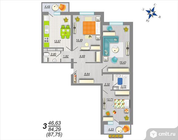 3-комнатная квартира 87,75 кв.м
