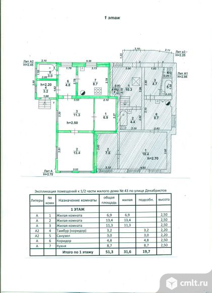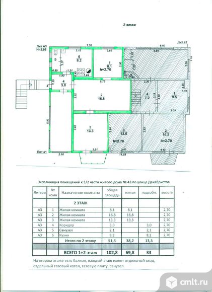 Половина жилого дома (103 м2 в два этажа в центре города в 50 м от каменного мостика) состоит из двух квартир, в каждой квартире 51 м2, отдельный вход, кухня, санузел и по 3 жилых комнаты. газ, вода, центральная канализация, телефон, интернет, электричество.