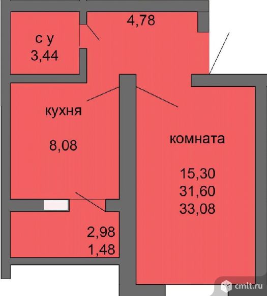 1-комнатная квартира 33,08 кв.м позиция 24