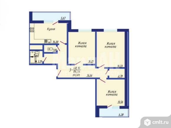3-комнатная квартира 91,57 кв.м