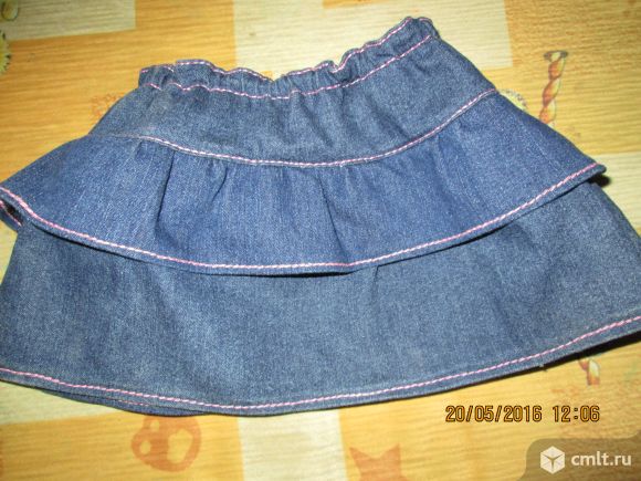 Продаётся джинсовая юбка на резинке очень удобная подходит под любую полноту .Три волана отстрочена розовой ниткой .Длина 18 см .Идёт на 1- 1. 5 лет