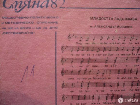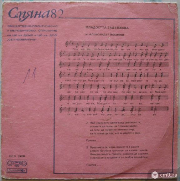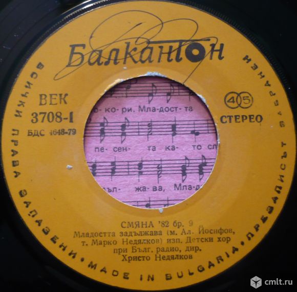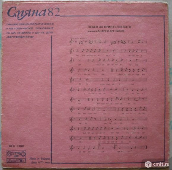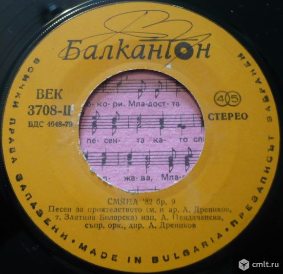 Обществено-политическо и методическо списание на ЦК на ДКМС и ЦС на ДПО "Септемврийче". Смяна '82 бр. 9. Младостта задължава (м. Александър Йосифов, т. Марко Недялков) изп. Детски хор при Бълг. радио, дир. Христо Недялков // Песен за приятелството (музика и ар. Андрей Дреников, т. Златина Билярска) изп. А. Пендачанска, съпр. орк., дир. А. Дреников. БДС 4648-79. Bulgaria. Жанр: Pop, Children's. Стиль: Educational. Пластинка прослушана: хорошо [G]. Оригинальная обложка: очень хорошо [VG].