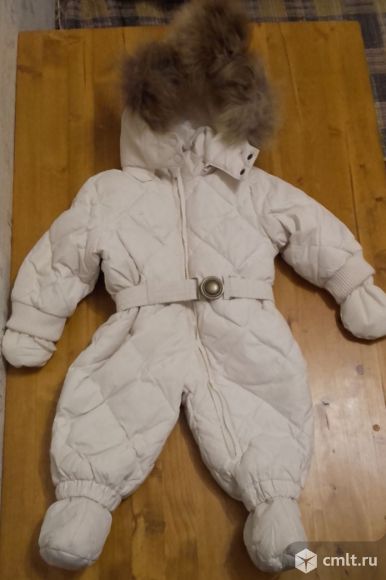 Легкий, мягкий, уютный, теплый (утеплитель пух-перо). Удобно, быстро и легко надевается. Хорошо закрывает горлышко ребенка. В комплекте: комбинезон, пинетки (отстегиваются), рукавички, капюшон (отстегивается), ремешок. Размер: 68 см (2-7 мес) Цвет: молочный (бежевый) Верх: 100% нейлон Подкладка: 60% хлопок, 40% полиэстер Утеплитель: 70% пух, 30% перо Надевали буквально несколько раз — в конце зимы был великоват, а сейчас уже мал. 07.04.2018 13:23