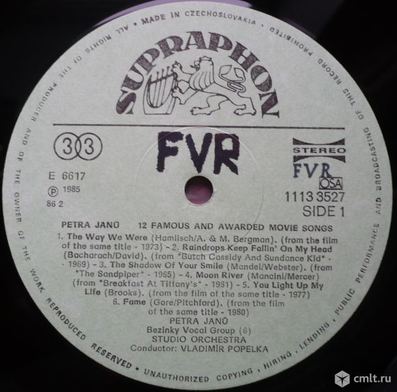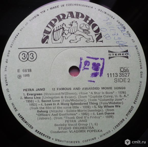 Petra Janu And Bezinky Vocal Group (6/1,6). Studio Orchestra. Leader: Vladimir Popelka. 12 Famous & Awarded Movie Songs. The Way We Were (1973) / Raindrops Keep Fallin' On My Head (1969) / The Shadow Of Your Smile (1965) / Moon River (1961) / You Light Up My Life (1977) / Fame (1980) // Evergreen (1976) / Mona Lisa (1950) / Secret Love (1953) / Love Is A Many Splendored Thing (1955) / Up Where We Belong (1982) / Last Dance (1978). Recorded in 1984. (P) 1985. Supraphon, 1986. Stereo 1113 3527 H. Номера матриц: C E 6617/E 6 // C E 6618/E 5. Manufacturing date code: 86 2. Жанр: Jazz, Pop, Funk / Soul. Стиль: Vocal, Easy Listening, Disco. Пластинка прослушана: идеально [M-]. Ламинированная обложка: хорошо [G], следы от намокания.
