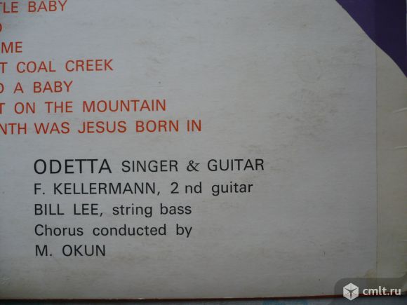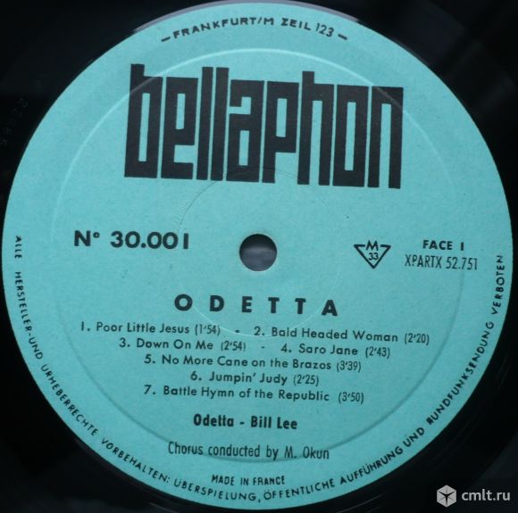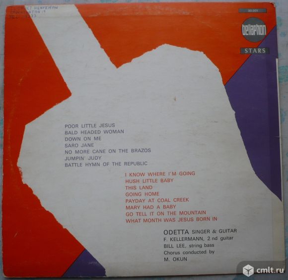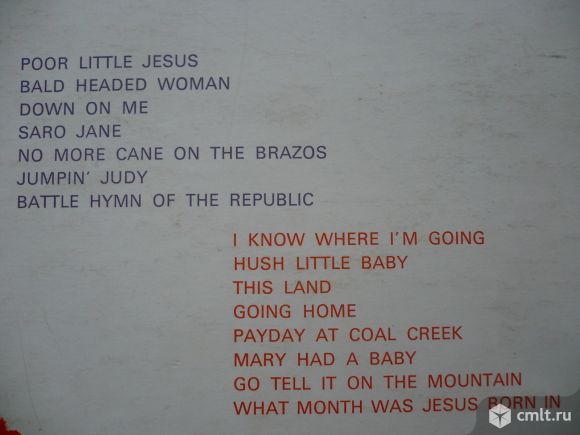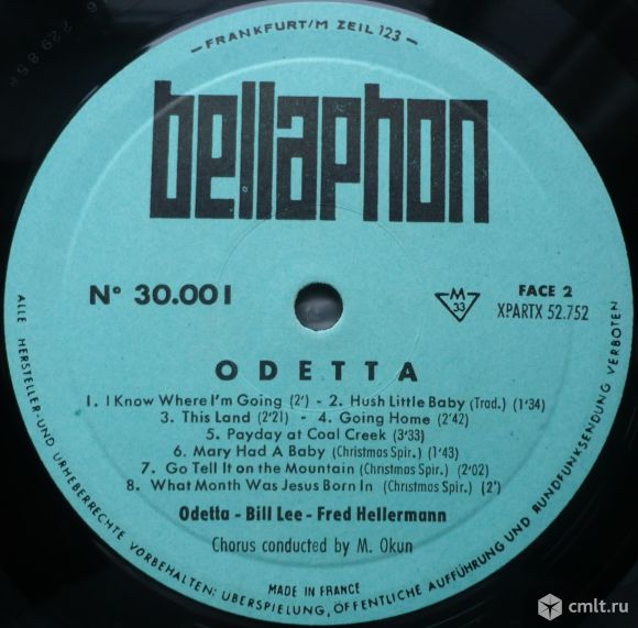 Odetta. Poor Little Jesus / Bald Headed Woman / Down On Me / Saro Jane / No More Cane On The Brazos / Jumpin' Judy / Battle Hymn Of The Republic // I Know Where I'm Going / Hush Little Baby / This Land / Going Home / Payday At Coal Creek / Mary Had A Baby / Go Tell It On The Mountain / What Month Was Jesus Born In. Odetta, singer & guitar. Fred Kellermann, 2nd guitar. Bill Lee, string bass. Chorus conducted by Milton Okun. На лейблах: "Made in France", German rights "Urheberrechte...". Released in a laminated "flipback" cover. Жанр: Folk, Blues. Стиль: Folk, Blues, Gospel, Soul. Американская певица, гитаристка, автор песен, и правозащитник, которая была значимой фигурой в американской народной музыке 1950-х и 1960-х годов. Пластинка прослушана: очень хорошо [VG+]. Обложка: отлично [E-], имеется надпись на обороте.