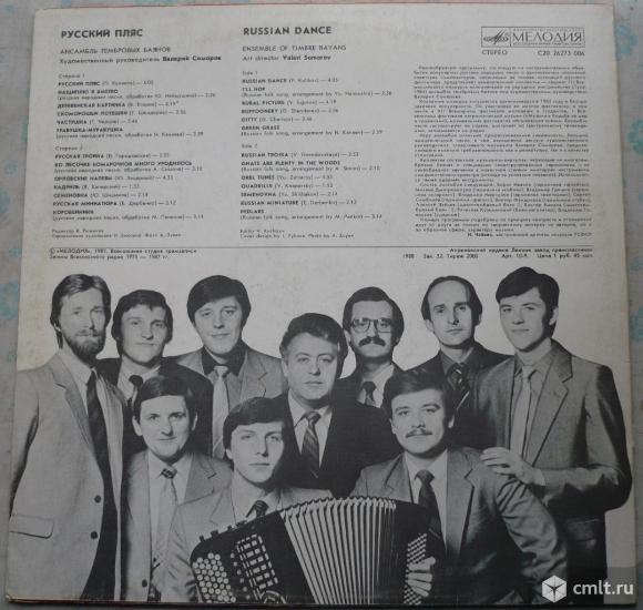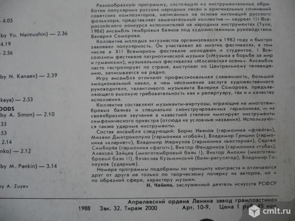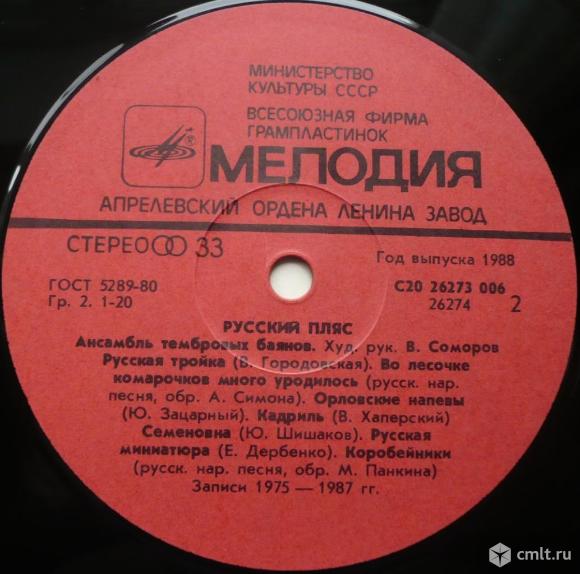 Художественный руководитель Валерий Соморов. Русский пляс (П. Куликов) / Нащиплю я хмелю (русская народная песня, обработка Ю. Наймушина) / Деревенская картинка (В. Егоров) / Скоморошьи потешки (Г. Шендерев) / Частушка (Г. Чернов) / Травушка-муравушка (русская народная песня, обработка Н. Канаева) // Русская тройка (В. Городовская) / Во лесочке комарочков много уродилось (русская народная песня, обработка А. Симона) / Орловские напевы (Ю. Зацарный) / Кадриль (В. Хаперский) / Семеновна (Ю. Шишаков) / Русская миниатюра (Е. Дербенко) / Коробейники (русская народная песня, обработка М. Панкина). Записи Всесоюзного радио 1975 - 1987 гг. (C) "Мелодия", 1987. Стерео С20 26273 006. Апрелевский завод (красные лейблы), 1988. Зак. 32. Тираж 2000. СССР. Жанр: Folk. Пластинка прослушана: очень хорошо [VG+] // отлично [E]. Обложка: отлично [E].