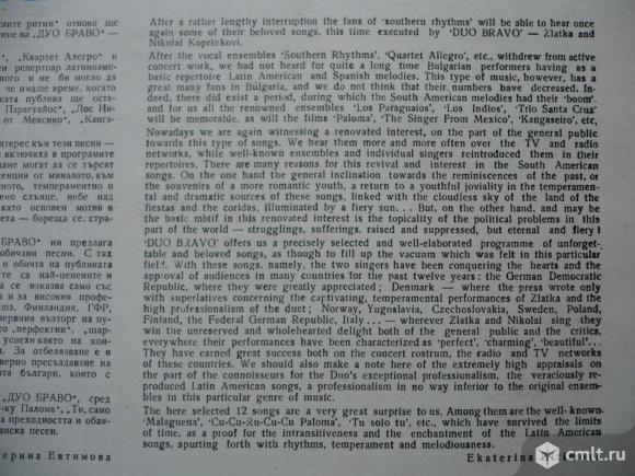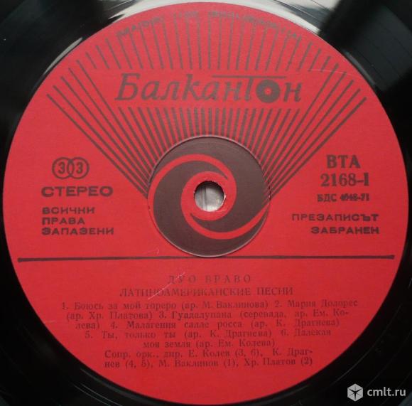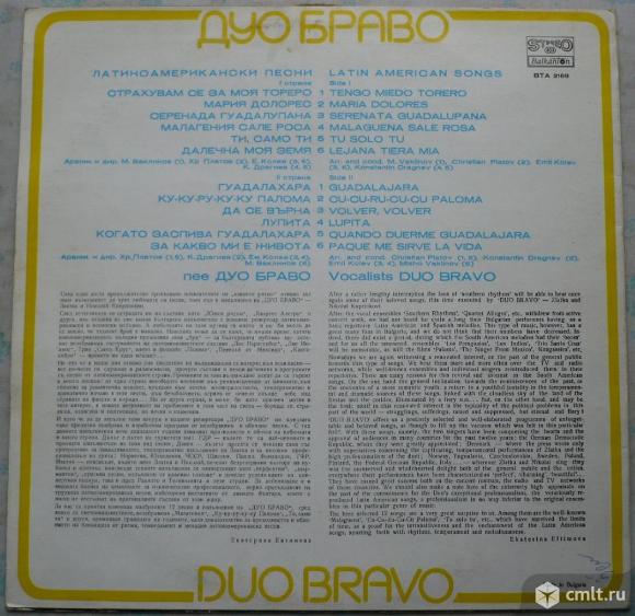 Duo Bravo (Zlatka and Nikolai Koprinkovi). Tengo Miedo Torero / Maria Dolores / Serenata Guadalupana / Malaguena Sale Rosa / Tu Solo Tu / Lejana Tiera Mia // Guadalajara / Cu-Cu-Ru-Cu-Cu Paloma / Volver, Volver / Lupita / Quando Duerme Guadalajara / Paque Me Sirve La Vida. Arr. and cond. Misho Vaklinov (1, 12), Christian Platov (2, 7, 11), Emil Kolev (3, 6, 9, 10), Konstantin Dragnev (4, 5, 8). BTA 2168. БДС 4648-71. Bulgaria. Жанр: Latin. Стили: Cha-Cha, Tango. Пластинка прослушана: удовлетворительно [F], на 3-ем и 5-ом треках имеются перескоки. Обложка: очень хорошо [VG+].