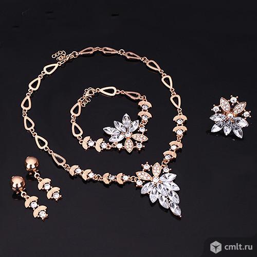 Стиль:классический,пол:для женщин,тип металла:позолота, материал:кубический циркон,форма/рисунок:растение,тип изделия:ювелирный набор.В комплекте:Ожерелье,серьги, браслет,кольцо.Цвет:белый.