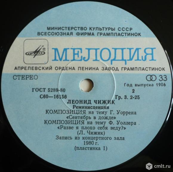 Леонид Чижик. Реминисценции. Пластинка 1. Пролог (Л. Чижик) / Монолог (Л. Чижик) / Эпилог (Л. Чижик) // Композиция на тему Г. Уоррена "Сентябрь в дожде" (Л. Чижик) / Композиция на тему Ф. Уоллера "Разве я плохо себя веду?" (Л. Чижик). Записи из концертного зала "Варшава" (Москва), 1979 г. (C) "Мелодия", 1986. Стерео С60 16155 006. Апрелевский завод (голубые с белым лейблы). Зак. 489-О-4600. СССР. Жанр: Jazz. Стиль: Post Bop. Пластинка прослушана: отлично [E]. Обложка: отлично [E].