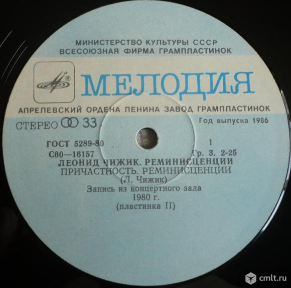 Леонид Чижик. Реминисценции. Пластинка 2. Причастность (Л. Чижик) / Реминисценции (Л. Чижик) // Посвящение (Л. Чижик) / Композиция на тему Д. Эллингтона "Зов креолки" (Л. Чижик). Записи из Ленинградской капеллы, 1980 г. (C) "Мелодия", 1986. Стерео С60 16157 000. Апрелевский завод (голубые с белым лейблы). Зак. 489-О-4600. СССР. Жанр: Jazz. Стиль: Post Bop. Пластинка прослушана: очень хорошо [VG+]. Обложка: отлично [E]. 23.01.2026 11:27