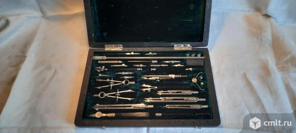Универсальная Советская готовальня "У32-Л", для выполнения чертежно-графических работ. Набор сохранился в отличном состоянии, что является редкостью сегодня. Готовальня представляет собой деревянный футляр, внутри обшита бархатом, всего 32 предмета, индекс Л - означает латунные. Возможна пересылка готовальни. Все фотографии соответствуют действительности и принадлежат именно этой готовальне.