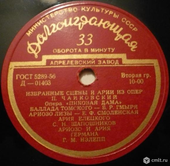 Опера "Евгений Онегин". Ария Онегина - А. А. Иванов / Ария Ленского - И. С. Козловский / Ария Гремина - М. О. Рейзен / Полонез. Оркестр Большого театра. Дирижер А. И. Орлов // П. Чайковский. Опера "Пиковая дама". Баллада Томского - Б. Р. Гмыря / Ариозо Лизы - Е. Ф. Смоленская / Ария Елецкого - С. Н. Шапошников / Ариозо и ария Германа - Г. М. Нэлепп. Министерство культуры СССР. Апрелевский завод (красные лейблы). Д-01402-3. ГОСТ 5289-56. Пластинка прослушана: удовлетворительно [F], заикание в начале трека 3 и в конце трека 4 Стороны 1, в остальном играет очень хорошо [VG]. Без обложки.