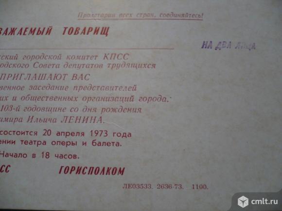 Открытка-приглашение. Воронежский городской комитет КПСС и исполком городского Совета депутатов трудящихся приглашают на торжественное заседание представителей партийных, советских и общественных организаций города, посвященное 103-й годовщине со дня рождения Владимира Ильича Ленина. Заседание состоится 20 апреля 1973 года в помещении театра оперы и балета.