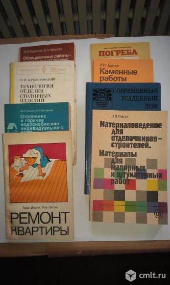 1. Арво Вески, Яак Вески "Ремонт квартиры" 1984 год - 120 руб. 2. В.Д.Чмырь Материаловедение для отделочников строителей. Материалы для малярных и штукатурных работ. 1990 год - 120 руб. 3. И.И.Ищенко Каменные работы. 1987 год - 120 руб. 4. Ю.П.Соснин, Е.Н.Бухаркин Отопление и горячее водоснабжение индивидуального дома. Справочное пособие. 1991 год - 260 руб 5. Н.И.Прозоровский Технология отделки столярных изделий. 1977 год - 120 руб 6. В.И.Горячев, В.А.Неелов Облицовочные работы- плиточные и мозаичные. 1984 год - 120 руб 7. В.М. Масютин Современный усадебный дом. Пособие для инд. застройщика. 1990 год - 120 руб. 8. Ю.В. Проскурин, Л.И. Короткевич Погреба для приусадебных участков. 1985 г. -25 руб Состояние книг хорошее. 07.01.2026 20:05