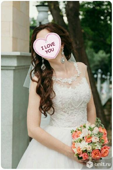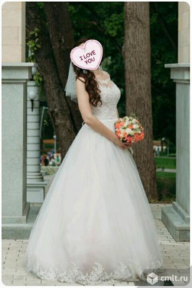 Элегантное свадебное платье А-силуэта, без шлейфа. Цвет пудровый и айвори. Размер 42-44, рост 170-174. Корсет с нежным кружевом, расшит маленькими жемчужинками и пайетками. Многослойная юбка с кружевом по низу, также расшит, как и корсет. Покупала в свадебном салоне за 35000р. Одевала один раз, в день свадьбы( в идеальном состоянии) после химчистки. В подарок- подьюбник с кольцами и чехол.