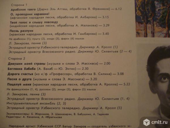 Арабское танго (Дариз Эль Атташ, обработка Я. Френкеля) / О, проводник каравана! (афганская народная песня, обработка И. Акбарова) / Твой голос я слышу повсюду (индийская народная песня, обработка А. Малакова) / Песнь разлуки (иранская народная песня, обработка И. Гамбарова) // Девушки моей страны (музыка и слова Э. Массиаса) / Беглянка Хабиба (А. Вахаб - Ю. Энтин) / Дорога счастья (из к/ф "Профессор", обработка В. Силина) / Песня о друге (музыка и слова Э. Массиаса) / Поцелуй меня (иранская народная песня, обработка А. Кролла). На арабском (1), пушту (2), хинди (3, 7), фарси (4, 9), французском (5, 8), русском (6) языках. Луиза Закирова, пение (3, 7). Эстрадный оркестр Узбекского телерадио. Дирижер А. Кролл (1, 9). Эстрадный оркестр Всесоюзного радио. Дирижер Ю. Силантьев (2-5, 8). Инструментальный ансамбль (6, 7). Ташкентская студия грамзаписи. Моно М60 47187 005. Апрелевский завод, 1987. Зак. 84-О-860. СССР. Жанры: Pop, Folk, World. Пластинка и обложка: идеально [M-].