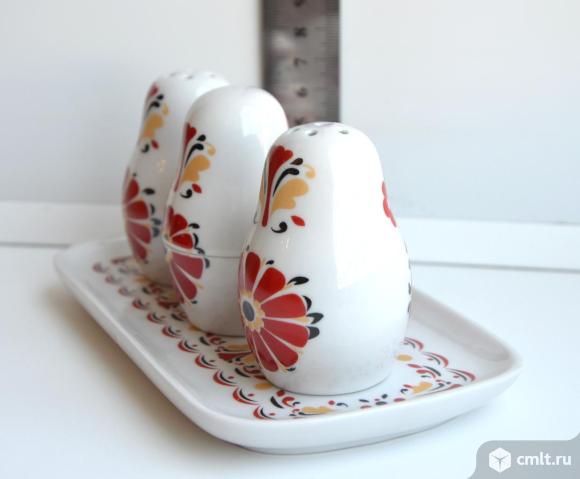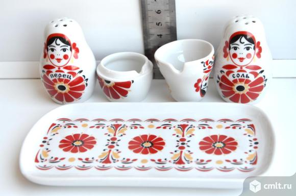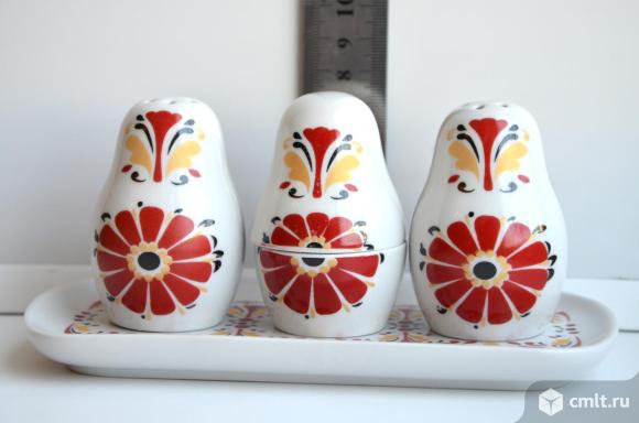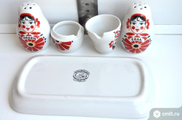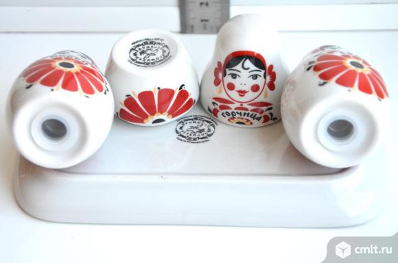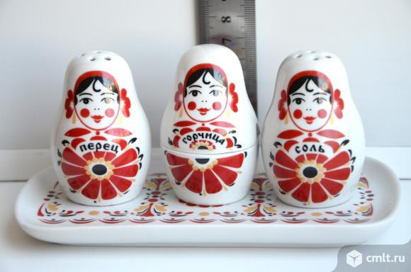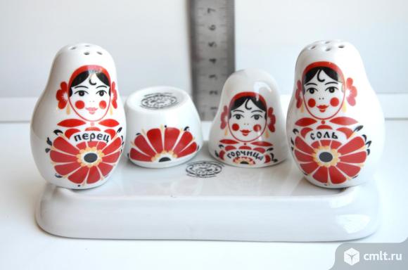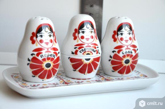Вербилки. Фарфоровая статуэтка набор для специй Веселушки матрешки. 4 предмета (соль, перец, горчица, поднос) , подарочная упаковка.