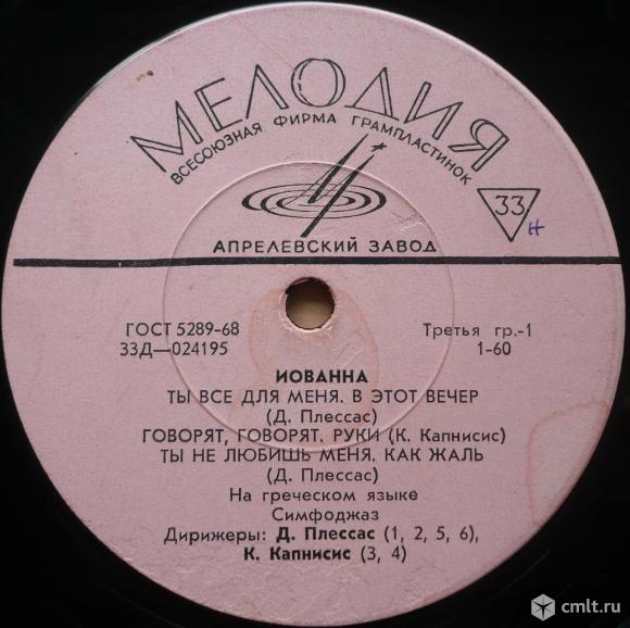 Yovanna (Ioanna Fassou Kalpaxi) (Greece). Иованна (Греция). Ты все для меня (Dimitri "Mimi" Plessas) / В этот вечер (Dimitri "Mimi" Plessas) / Говорят, говорят (Kostas Kapnisis) / Руки (Kostas Kapnisis) / Ты не любишь меня (Dimitri "Mimi" Plessas) / Как жаль (Dimitri "Mimi" Plessas) // Твоя любовь (Dimitri "Mimi" Plessas) / Окно (Dimitri "Mimi" Plessas) / Дождь (Kostas Kapnisis) / Любовь (Dimitri "Mimi" Plessas) / Звезда-звездочка (Dimitri "Mimi" Plessas) / Капитан Фафальос (Kostas Kapnisis). На греческом языке. Симфоджаз. Дирижеры: Dimitri "Mimi" Plessas (1, 2, 5, 6, 7, 8, 10, 11), Kostas Kapnisis (3, 4, 9, 12). Мелодия, 1963. 33Д-024195-6. ГОСТ 5289-68. Апрелевский завод (розовые лейблы), 1969. СССР. Моно. Жанры: Jazz, Pop. Пластинка прослушана: хорошо [G], имеются царапины, щелчки. Простой белый бумажный конверт: удовлетворительно [F].