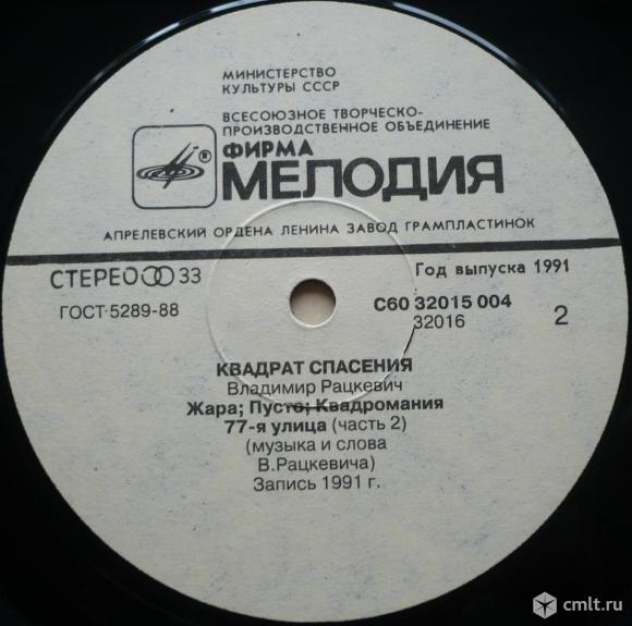 Владимир Рацкевич. Квадрат спасения. Запись 1991 г. Объединение "Лава". (C) ВТПО "Фирма Мелодия", 1991. Стерео С60 32015 004. Апрелевский завод (белые лейблы), 1991. Зак. 19. Тираж 5000. СССР. Жанры: Electronic, Rock. Стили: Goth Rock, Experimental. Пластинка прослушана: идеально [M-]. Обложка: хорошо [G].
