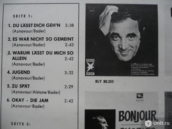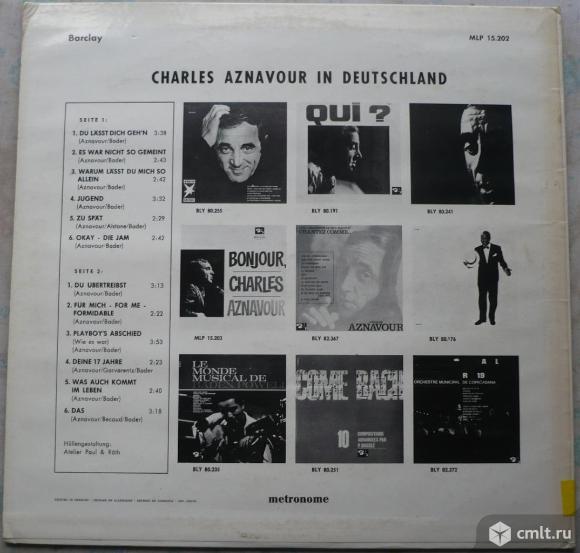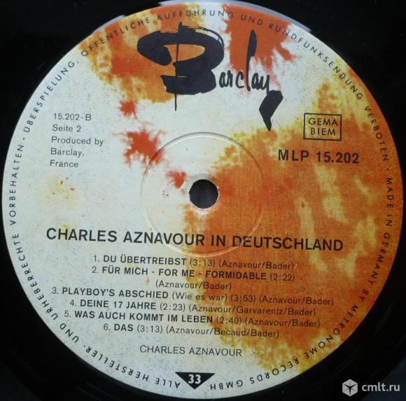 Charles Aznavour. Charles Aznavour In Deutschland. Du Laesst Dich Geh'n (Aznavour/Bader) / Es War Nicht So Gemeint (Aznavour/Bader) / Warum Laesst Du Mich So Allein (Aznavour/Bader) / Jugend (Aznavour/Bader) / Zu Spaet (Aznavour/Alstone/Bader) / Okay - Die Jam (Aznavour/Bader) // Du Uebertreibst (Aznavour/Bader) / Fuer Mich - For Me - Formidable (Aznavour/Bader) / Playboy's Abschied (Wie es war) (Aznavour/Bader) / Deine 17 Jahre (Aznavour/Garvarentz/Bader) / Was Auch Kommt Im Leben (Aznavour/Bader) / Das (Aznavour/Becaud/Bader). Barclay. Metronome. MLP 15.202. Germany. Жанры: Pop, Folk, World, & Country. Стили: Schlager, Chanson. Пластинка прослушана: отлично [E]. Обложка: отлично [E].