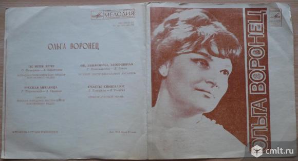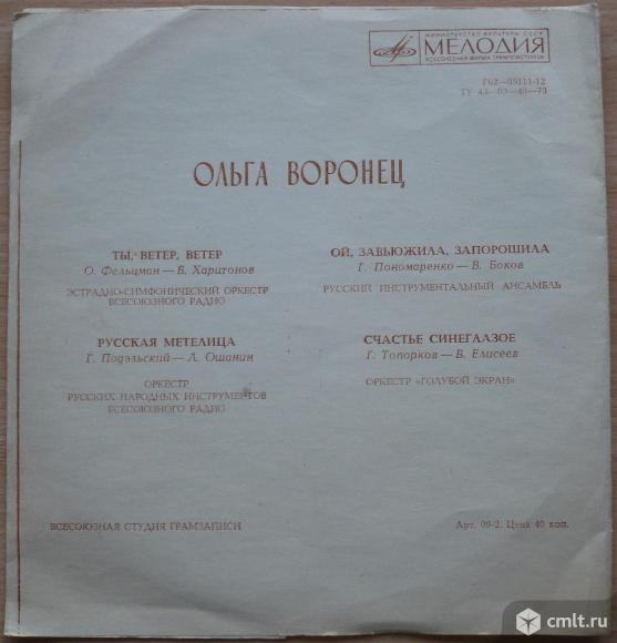 Ольга Воронец. Ты, ветер, ветер (О. Фельцман - В. Харитонов) Эстрадно-симфонический оркестр Всесоюзного радио / Русская метелица (Г. Подэльский - Л. Ошанин) Оркестр русских народных инструментов Всесоюзного радио // Ой, завьюжила, запорошила (Г. Пономаренко - В. Боков) Русский инструментальный ансамбль / Счастье синеглазое (Г. Топорков - В. Елисеев) Оркестр "Голубой экран". Всесоюзная студия грамзаписи. Мелодия. Г62-05111-12. ТУ 43-03-48-73. СССР. Моно. Голубая пластинка. Жанры: Pop, Folk. Пластинка прослушана: визуально отлично [E], играет очень хорошо [VG]. Обложка: очень хорошо [VG].