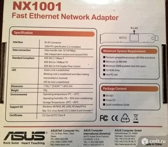 Внутренняя сетевая карта ASUS NX1001 PCI б/у в рабочем состоянии. вместе с драйвером.
