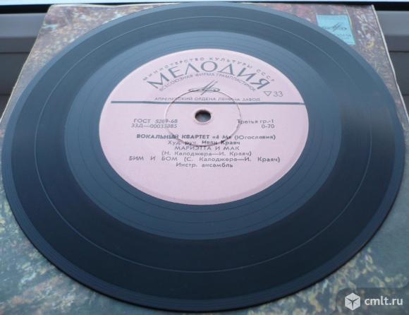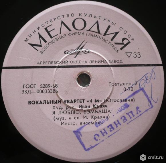 Kvartet 4M (Croatia). Вокальный квартет "4 М" (Югославия). Худ. рук. Иван Краяч. Инстр. ансамбль. Мариэтта и мак [Marijeta i mak] (Н. Калоджера - И. Краяч) / Бим и Бом [Bim i Bom] (С. Калоджера - И. Краяч) // Я люблю [Volim Te] (муз. и сл. И. Краяча) / Бэмбаша [Kad ja podoh na Bembasu] (муз. и сл. И. Краяча). Мелодия, 1972. 33Д-00033385-6. ГОСТ 5289-68. Апрелевский ордена Ленина завод (розовые лейблы). СССР. Моно. Жанры: Jazz, Pop. Стили: Chanson, Easy Listening, Vocal. Пластинка прослушана: идеально [M-]. Общая бумажная обложка фирмы "Мелодия": идеально [M-].