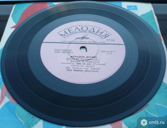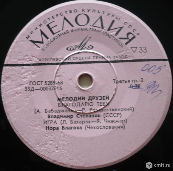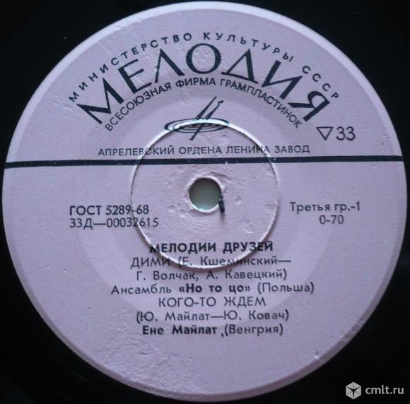 Мелодии друзей. Дими (Е. Кшеминский - Г. Волчак, А. Кавецкий) Ансамбль "Но то цо" (Польша) / Кого-то ждем (Ю. Майлат - Ю. Ковач) Ене Майлат (Венгрия) // Благодарю тебя (А. Бабаджанян - Р. Рождественский) Владимир Степанов (СССР) / Игра (Л. Бахарах - Я. Чижмар) Нора Благова (Чехословакия). Оригинальный треклист: Dimi (Jerzy Krzeminski - Grzegorz Walczak, Aleksander Kawecki) "No To Co" (Poland) / Someone Waiting For (Majlath Julia - Kovats Judit) Majlath Jeno (Hungary) // Thank You (Arno Babajanian - Robert Rozhdestvensky) Vladimir Stepanov (USSR) / Hra (I'll Never Fall In Love Again) (Burt Bacharach - Jan Cizmar) Nora Blahova (Czechoslovakia). Мелодия, 1972. 33Д-00032615-6. ГОСТ 5289-68. Апрелевский ордена Ленина завод (розовые лейблы). СССР. Моно. Жанры: Rock, Pop. Стили: Beat, Pop. Пластинка прослушана: идеально [M-]. Общая бумажная обложка фирмы "Мелодия": отлично [E].