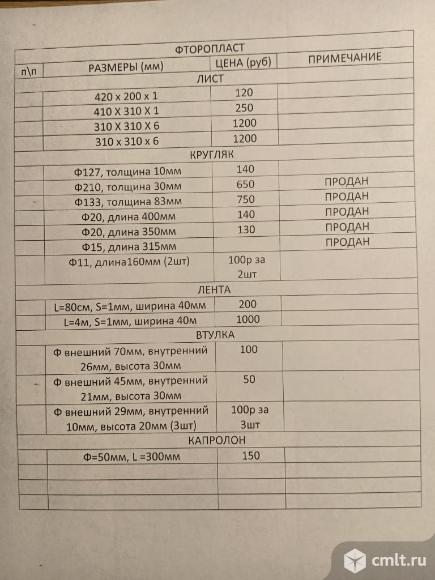 Фторопласт разный. Размеры и цену смотрите на фото в таблице.