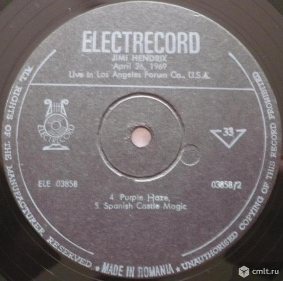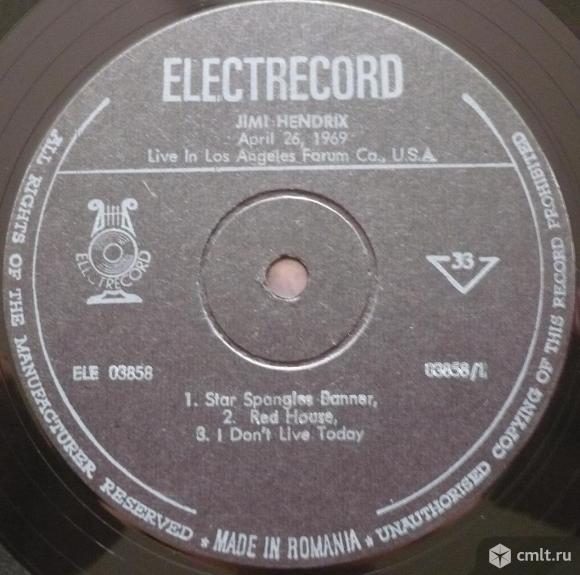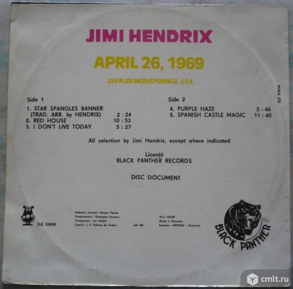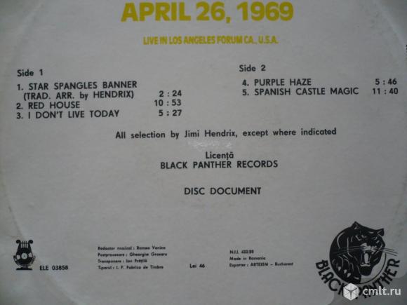 Jimi Hendrix. April 26, 1969, Live in Los Angeles Forum CA., U.S.A. Disc Document. 1. Star Spangles Banner (Trad. Arr. by Hendrix) 2:24 / 2. Red House 10:53 / 3. I Don't Live Today 5:27 // 4. Purple Haze 5:46 / 5. Spanish Castle Magic 11:40. All selection by Jimi Hendrix, except where indicated. Licensed from Black Panther Records. Electrecord, 1990. ELE 03858. N.I.I. 433/88. Romania. Mono. Жанры: Rock, Blues. Стили: Psychedelic Rock, Blues Rock, Acid Rock, Electric Blues, Hard Rock. Пластинка прослушана: отлично [E]. Ламинированная обложка: идеально [M-].