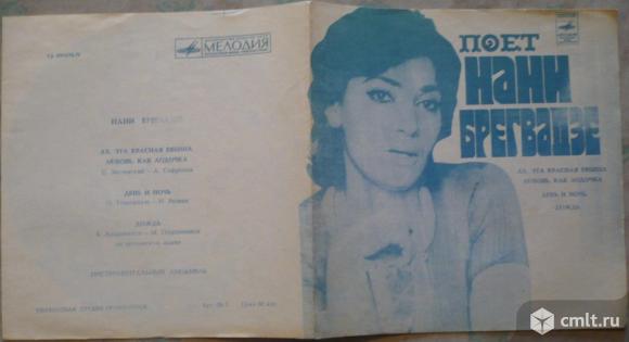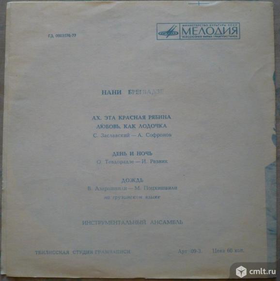 Нани Брегвадзе. Поет Нани Брегвадзе. Ах, эта красная рябина (С. Заславский - А. Софронов) / Любовь, как лодочка (С. Заславский - А. Софронов) // День и ночь (О. Тевдорадзе - И. Резник) / Дождь (В. Азарашвили - М. Поцхишвили) на грузинском языке. Инструментальный ансамбль. Мелодия, 1973. ГД 0003576-77. Матричные номера: 33ГД0003575/1-1 // 33ГД0003576/1-1. Тбилисская студия грамзаписи. Грузия, СССР. Голубая пластинка. Моно. Жанр: Pop. Стиль: Vocal. Пластинка прослушана: идеально [M]. Обложка: идеально [M].