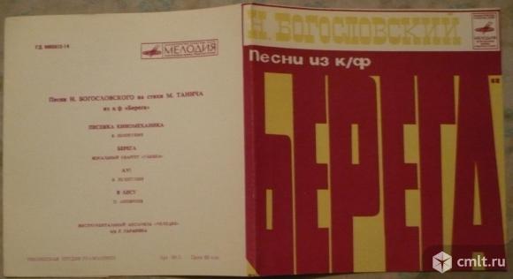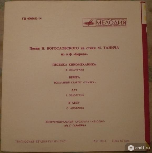 Никита Богословский - Михаил Танич. Песни Н. Богословского на стихи М. Танича из к/ф "Берега". Песенка киномеханика - Валерий Золотухин / Берега - Вокальный квартет "Улыбка" // Ау! - Валерий Золотухин / В лесу - Олег Анофриев. Инструментальный ансамбль "Мелодия" п/р Г. Гараняна. Мелодия, 1973. ГД 0003613-14. Тбилисская студия грамзаписи. Грузия, СССР. Голубая пластинка. Моно. Жанры: Pop, Stage & Screen. Стили: Soundtrack, Vocal. Пластинка прослушана: визуально идеально [M-], играет хорошо [G] // очень хорошо [VG]. Обложка: идеально [M].