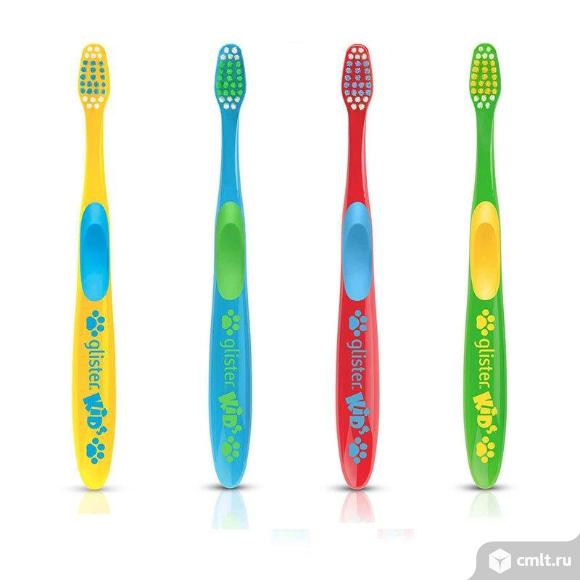 "Детские зубные щетки Glister содержаться в упаковке в количестве 4 штук различного оттенка.