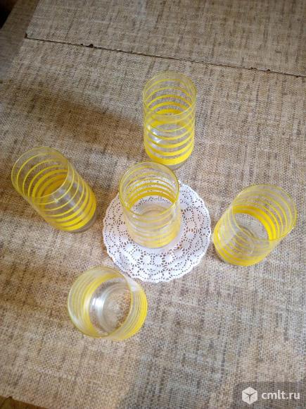 Продам 5 прозрачных стеклянных стаканов с желтыми горизонтальными полосами.
