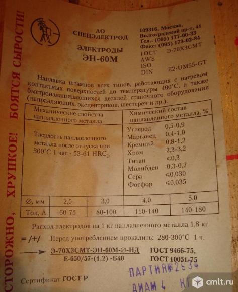 - Э-70Х3СМТ – ЭН-60М, диам. 4мм. кол-во 100кг. по 40 руб/кг. В заводской упаковке, пр-ва «Спецэлектрод». ЭН-60М - предназначенные для наплавки штампов всех типов, работающих с нагревом контактных поверхностей до температуры 400 °С, а также быстроизнашивающихся деталей и станочного оборудования (направляющих, эксцентриков, шестерен и др.). 16.11.2025 10:31