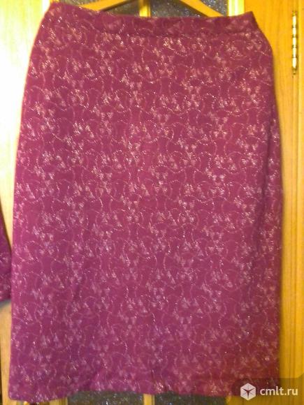 Костюм новый из польского трикотажа с серебряным люрексом (ателье), р. 50-52, юбка на подкладка, длина 71 см, блузона 60 см, рукова 52см.