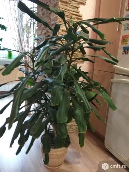Драцена смотрится весьма декоративно, высотой 1,3м, с длинными зелёными листьями. В хорошем керамическом горшке, пересадки не требует.