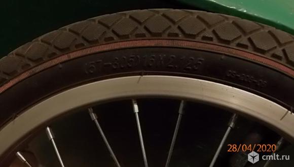 Колеса 16", хромированные крылья, тормоз задний педальный, имеются вспомогательные колёса для устойчивости.