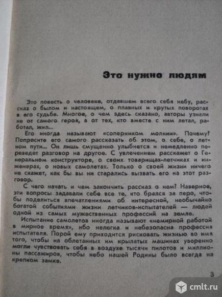 Эта повесть о Герое Советского Союза, Георгии Константиновиче Мосолове лётчике-испытателе ОКБ А. И. Микояна. Совершил первый вылет и провел летные испытания первых экземпляров опытных истребителей CH, СД-5, СИ-6, СМ-9/2, СМ-9/3, (МиГ-19С), Е-2, И-3У, И-7У, И-75, СМ-12ПМ, И-75Ф, Е-6/3, Е-66 (МиГ-21), Е-152А, Е-6/9, Е-152, Е-8, Е-166. Участвовал в испытаниях МиГ-17 (СДК-5), МиГ-17 (СДК-7), МиГ-17 (СИ-10), МиГ-17 (СИ-16), Е-2А, МиГ-19ПУ (СМ-50), Е-4, Е-6/4, Е-7. Он провел летные испытания многих первых экземпляров реактивных двигателей, различных опытных систем радионавигации, перехвата и вооружения. Установил мировые авиационные рекорды. 24.11.2023 11:05