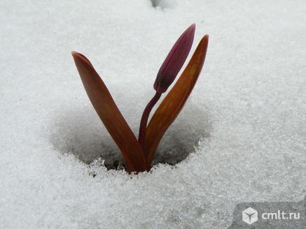 Раньше всех первоцветов цветет кандык сибирский или эритрониум (Erythronium sibiricum) – на фото № 2 видно, как его тугой бутон пробивается сквозь еще не стаявший снег. Это многолетнее луковичное растение семейства лилейные Неприхотлив, зимостоек. Подробнее о кандыке сибирском можно прочитать в моей статье на сайте питомника.