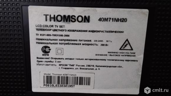 ЖК телевизор THOMSON 40M71NM20. Диагональ 102 (40"). Габариты: ширина 106 см, высота 80 см. Пульт в наличии. Эксплуатация барежная, в одних руках. Показывает чётко, цвета яркие. Не битый, не падал! Из недостатков - полоса (на фото).