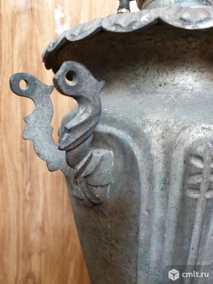 Самовар старинный, 5 литров, высота по конфорке 45 см. Ручки слегка примяты, погнутость в районе крана. Отсутствуют колосник, заглушка, ключ крана.