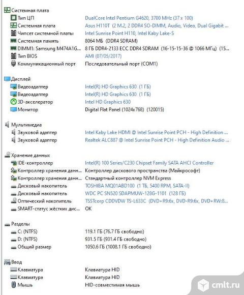 Моноблок DEPO Neos MC223 оптимизирован как для работы со стандартными приложениями, так и для решения специализированных задач. Операционная система Microsoft Windows 10 Professional 64-bit Процессор Intel® Intel Pentium G4620 - 3.70GHz (4-х потоковый) Оперативная память SO-DIMM 8GB DDR3-1600, есть ещё 1 свободное место Видеокарта Intel® HD Graphics Integrated Video 1GB Экран 24'', Full HD IPS (1920 x 1080), матовый экран Жесткий диск: первый - 128GB SSD M2 для OS второй - 1000GB 5400rpm SATA hard drive для архива Привод оптический DVD±RW Вебкамера 2Mp Wi-Fi M2 встроенный Бысрый, удобный, стильный, отличное состояние. Оплата только наличными. 19.08.2025 19:10