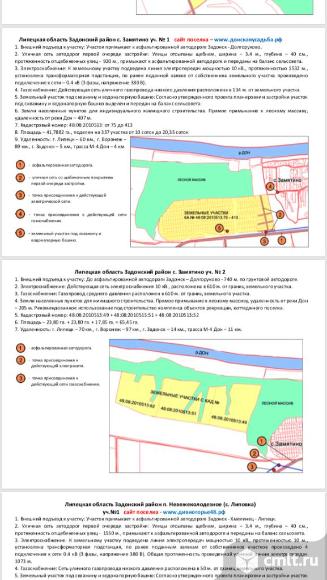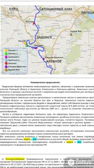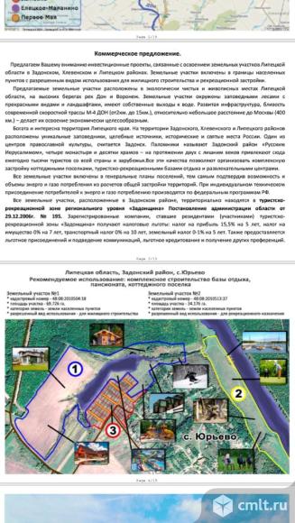 Продаются – земельные участки рекреации и жс (до 539 га.) для инвестиционных проектов комплексного строительства сети баз отдыха, загородных отелей, развлекательных центров и парков, детских спортивных лагерей, коттеджных поселков - под льготные программы развития строительства малоэтажного жилья, усадеб, пансионатов, и т.д. в туристско-рекреационной зоне «задонщина», расположенных в живописных и экологически чистых местах липецкой области в окружении лесных массивов на берегу рек дон и воронеж. земельные участки расположены недалеко от трассы «м-4 дон» в задонском, хлевенском, липецком районах по новой скоростной дороге москва – сочи. по каждому участку снят видеоролик с полной информацией по участку. если вас заинтересовало данное предложение пищите звоните, я вам отправлю все презентации. 06.02.2026 09:19