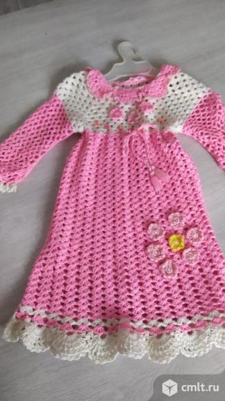 Продаётся детское платье. Связано крючком со спущенным руковом. В отличном состояние. Длина платья 64см. Длина рукава 35см.