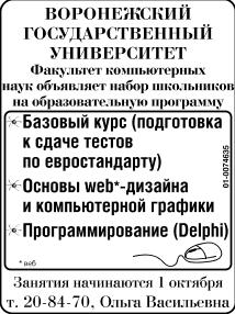 ВОРОНЕЖСКИЙ ГОСУДАРСТВЕННЫЙ УНИВЕРСИТЕТ Факультет компьютерных наук объявляет набор школьников на образовательную программу. Базовый курс (подготовка к сдаче тестов по евростандарту). Основы web*-дизайна и компьютерной графики. Программирование (Delphi). *Веб. Занятия начинаются 1 октября.
