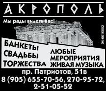 Рубрика, в которой публиковалось объявление, удалена. Выберите другую рубрику. АКРОПОЛЬ. Банкеты. Свадьбы. Торжества. Любые мероприятия